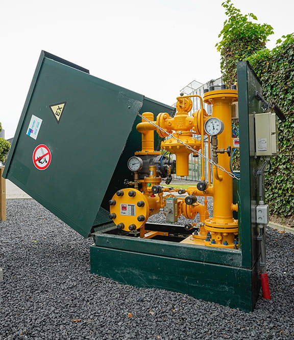 Een hogedruk gasaansluiting wordt altijd geplaatst in een uitpandige opstellingsruimte. Deze ruimte plaatsen wij. Bij een uitpandige opstellingsruimte worden eisen gesteld aan de buitenkast en de terreinafwerking.