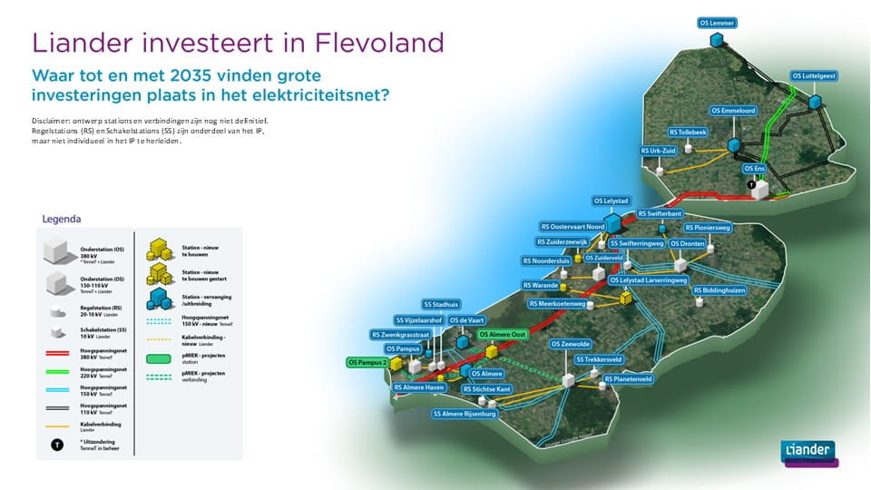 Liander werkt in Flevoland aan haar gas- en elektriciteitsnet. Dit is nodig om de ontwikkelingen voor wonen, welzijn en welvaart in de regio mogelijk te maken. De komende jaren blijft Liander daarom investeren in de uitbreiding van het gas- en elektriciteitsnet. Liander breidt in de komende tien jaar in Flevoland drie bestaande onderstations uit en bouwt vijf nieuwe onderstations bij. Daarnaast investeren we in de aanleg van nieuwe schakelstations en nieuwe regelstations. Schakelstations worden geplaatst op locaties waar het omzetten van spanning niet nodig is, maar waar de spanning op 20 kV of 10 kV wel moet worden verdeeld over meerdere aansluitingen. Transformatorhuisjes, kleine windmolens en zonneweiden worden op deze schakelstations aangesloten.