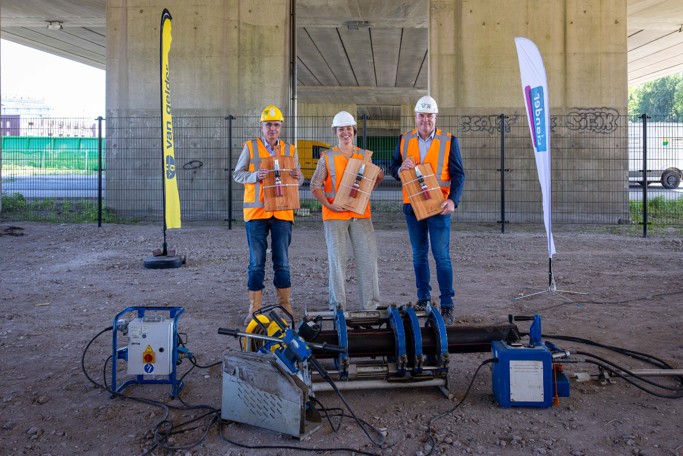 De werkzaamheden zijn op maandag 30 juni officieel van start gegaan. Coen Lageveen (wethouder gemeente Purmerend, portefeuille Energietransitie, Duurzaamheid en Milieu), Corine Huurneman (manager middenspanning bij Liander) en Berry Krouwel (directeur projecten Van Gelder Kabel-, Leiding- en Montagewerken) gaven gezamenlijk het startsein door symbolisch twee buizen aan elkaar te lassen.