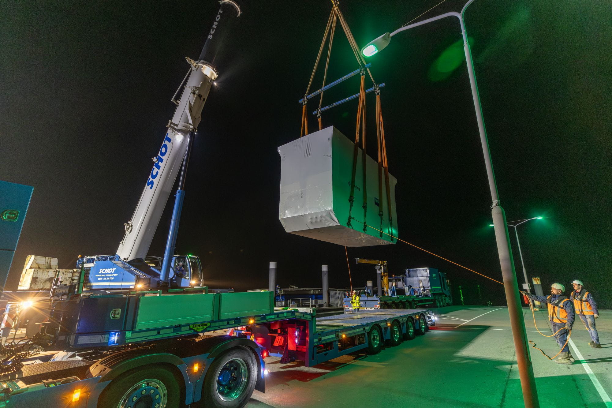 Liander werkt samen met de gemeente en andere partijen aan een ingrijpende uitbreiding van het elektriciteitsnet op het eiland. Gisteravond arriveerden zeven zogenoemde distributieruimtes op Ameland. Elk van deze installaties is zo groot als een zeecontainer en weegt ongeveer 47.000 kilo. Ze werden vorige week woensdag in Rotterdam geladen en zijn per schip naar Ameland gebracht. Daar zijn ze met een grote kraan gelost. Diepladers transporteren de distributieruimtes naar hun tijdelijke locatie op het strand nabij vliegveld Ballum. Van daaruit worden ze deze week nog naar de definitieve locaties vervoerd.