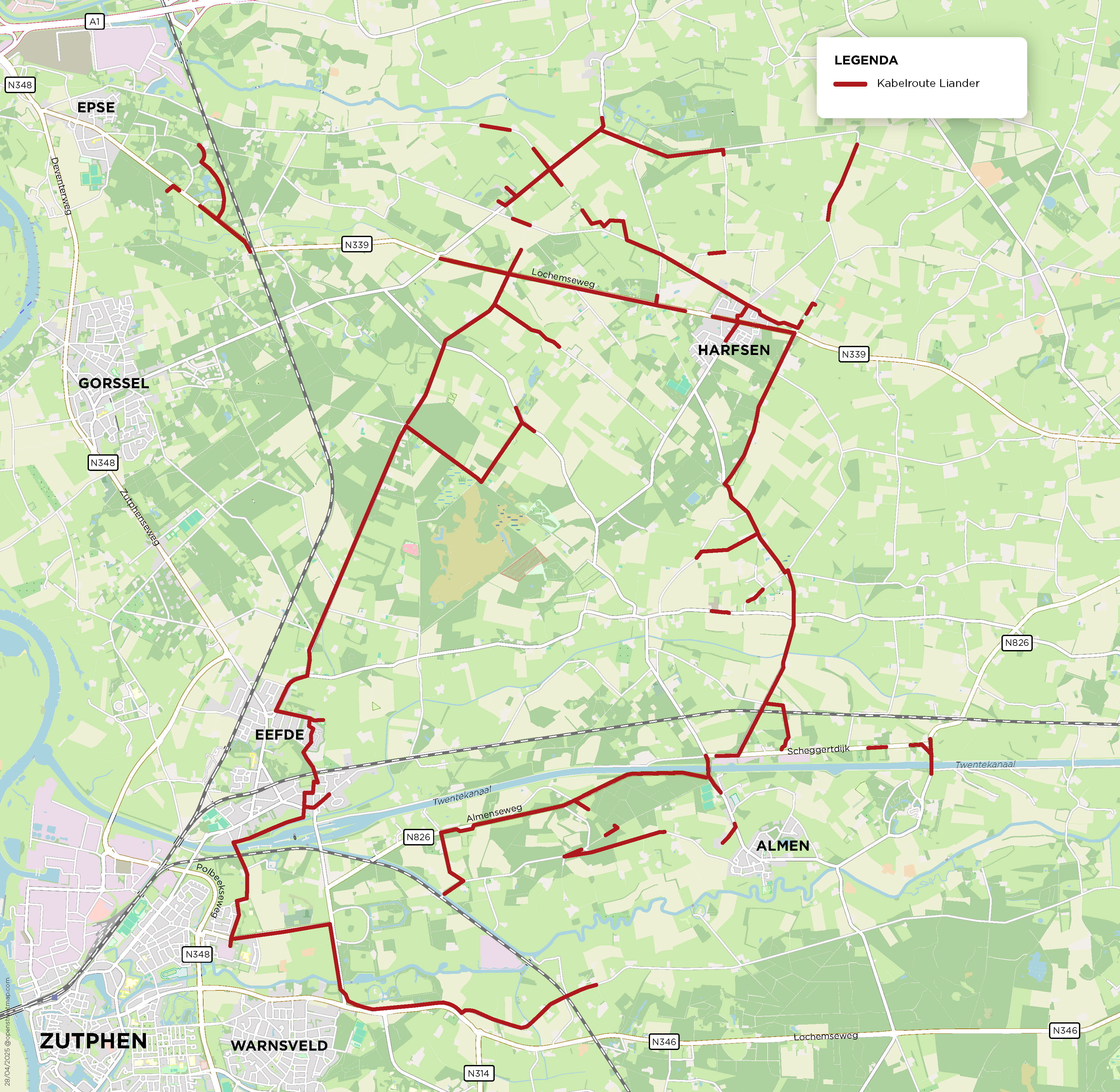 Zie hieronder de overzichtskaart met het ontwerp van de kabelroute voor project Harfsen. Deze kabelroute is onder voorbehoud en kan mogelijk wijzigen.