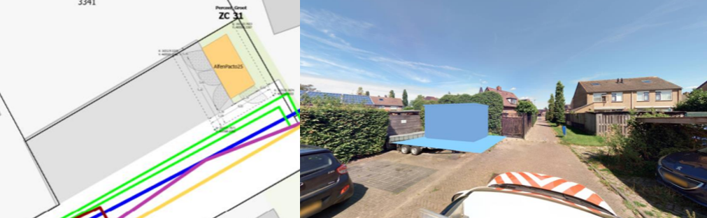 Aan de rand van het parkeerterrein. We plaatsen het huisje op het stukje groen en op 1 parkeerplaats. Hierdoor gaat er 1 parkeerplek verloren.