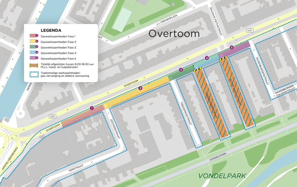 De werkzaamheden zijn aan de oneven kant van de Overtoom tussen huisnummer 519 en 429.