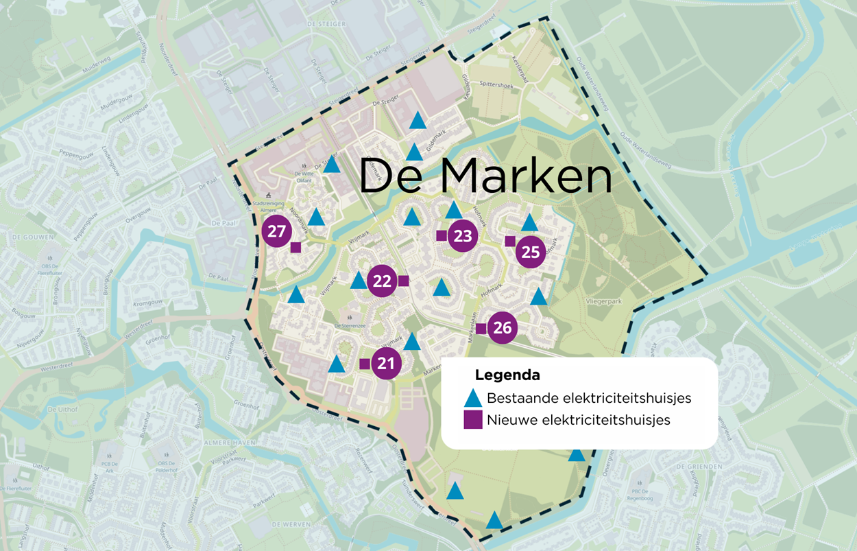 Er komen 7 nieuwe elektriciteitshuisjes voor de uitbreiding van het stroomnet in De Marken. Dit zijn de Ambachtsmark, Vrijmark, Zuidmark, Hofmark, Redemark, Sportmark, Brugmark, Noordmark, Gildemark. Samen met de gemeente zoeken we zorgvuldig naar geschikte plekken. Als we het werk gaan uitvoeren leggen we ook meer kabels en vervangen we bestaande kabels.