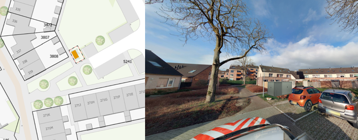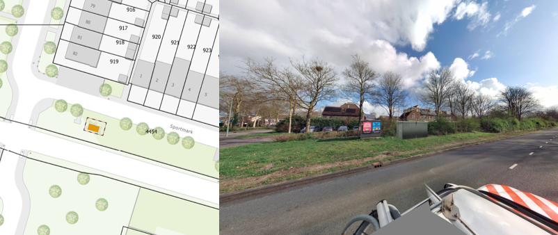 Op het gras naast de parkeerplekken. Als het nodig is, verplaatsen we de lantaarnpaal.