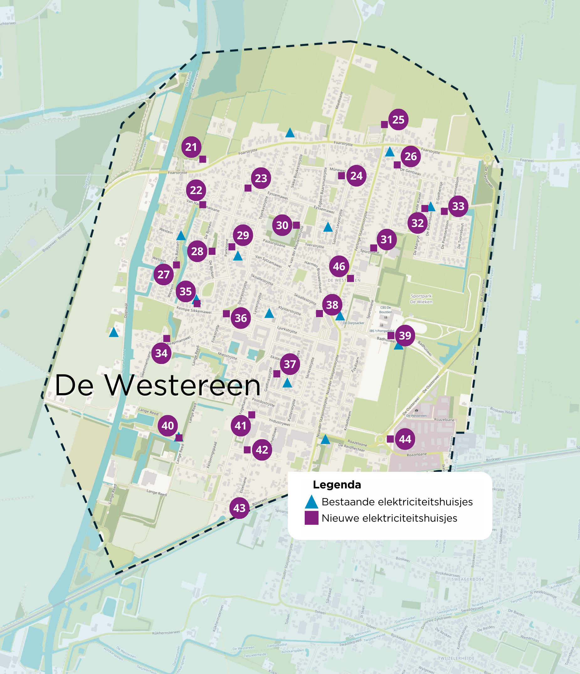 Plek 21, 22 en 43 plaatsen we op een eerder moment. De rest van de huisjes plaatsen we na 2028.