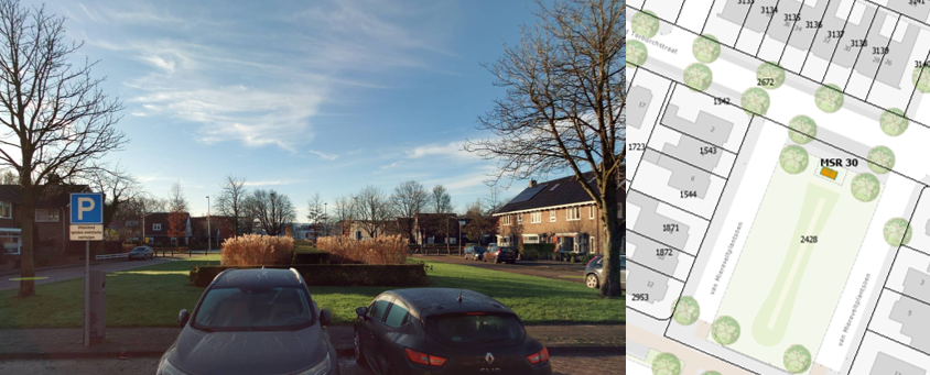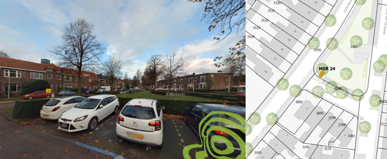 Tussen de parkeervakken in. Bomen worden gekapt. We overleggen met de gemeente waar zo nodig nieuwe bomen komen.