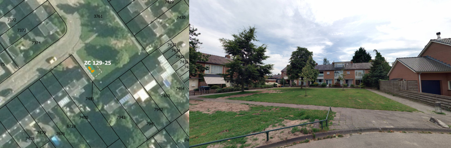 In het openbaar groen. We verwijderen de boom die er staat en planten een nieuwe boom terug. Ook wordt de groenstrook vergroot in samenspraak met de gemeente. Het huisje krijgt steenstrips en een groen sedum dak. Direct omwonenden hebben via een brief een optie gekregen om mee te denken over de kleur steenstrips.