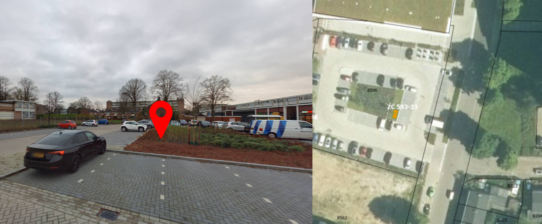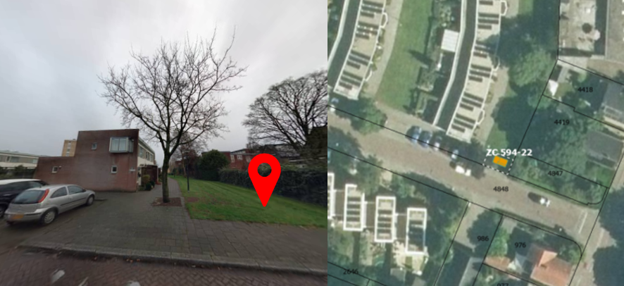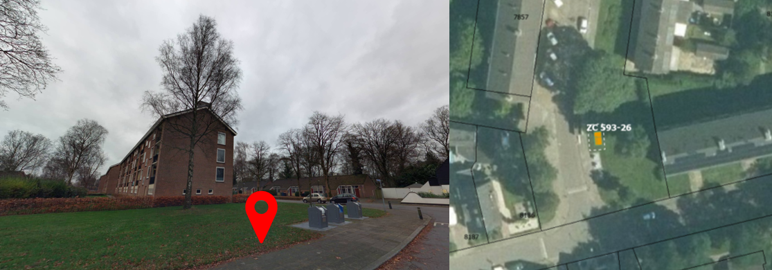 In het groen, naast de ondergrondse afvalcontainers. Het huisje krijgt een groene kleur.