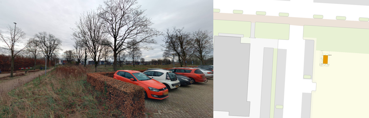 In het groen, achter de parkeerplekken. Het huisje krijgt een donkergrijze kleur.
