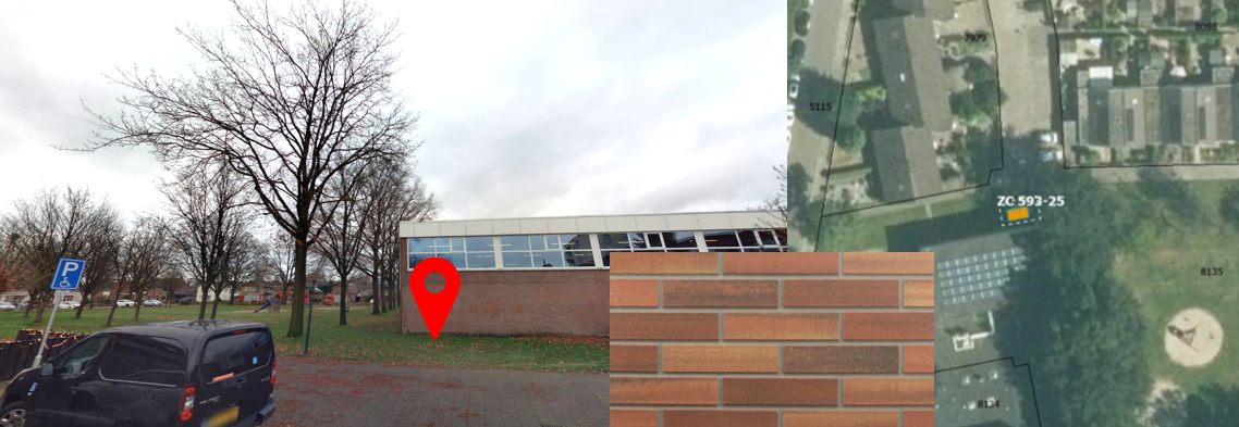 In het groen, achter een gymzaal. Het huisje krijgt steenstrips.