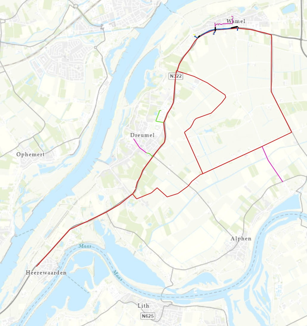 Zie hieronder de overzichtskaart met het ontwerp van de kabelroute voor project Dreumel en Wamel. Deze kabelroute is onder voorbehoud en kan mogelijk wijzigen.