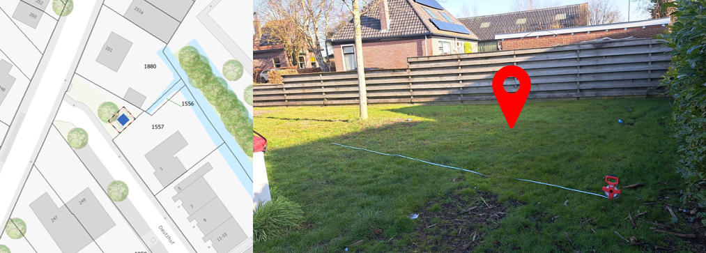 Op het grasveld. We houden met de plek rekening met het uitzicht vanuit het raam van Brederodestraat 2. We kappen 1 boom.
