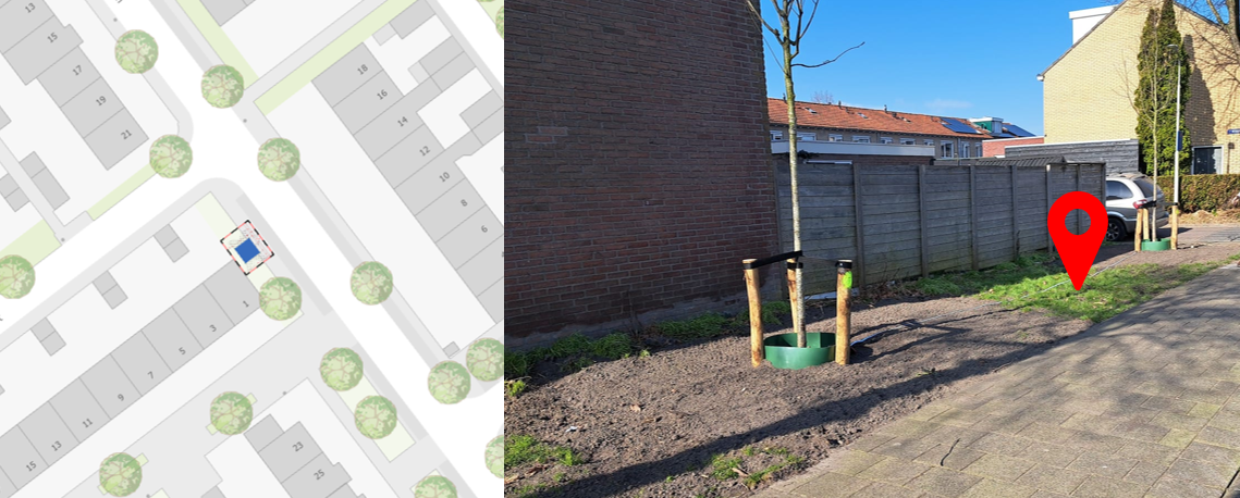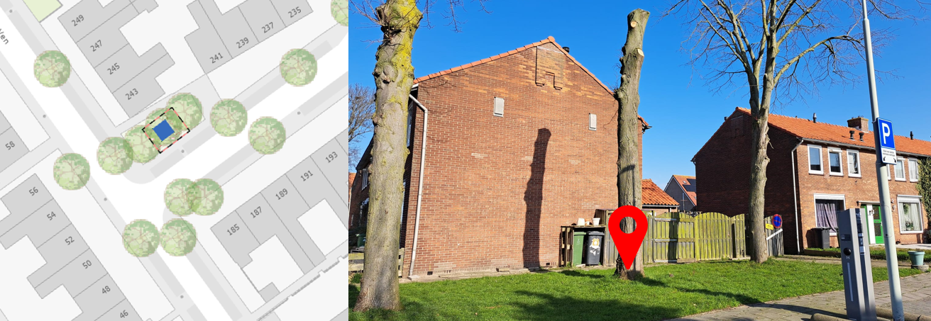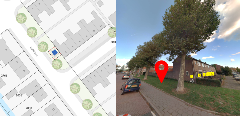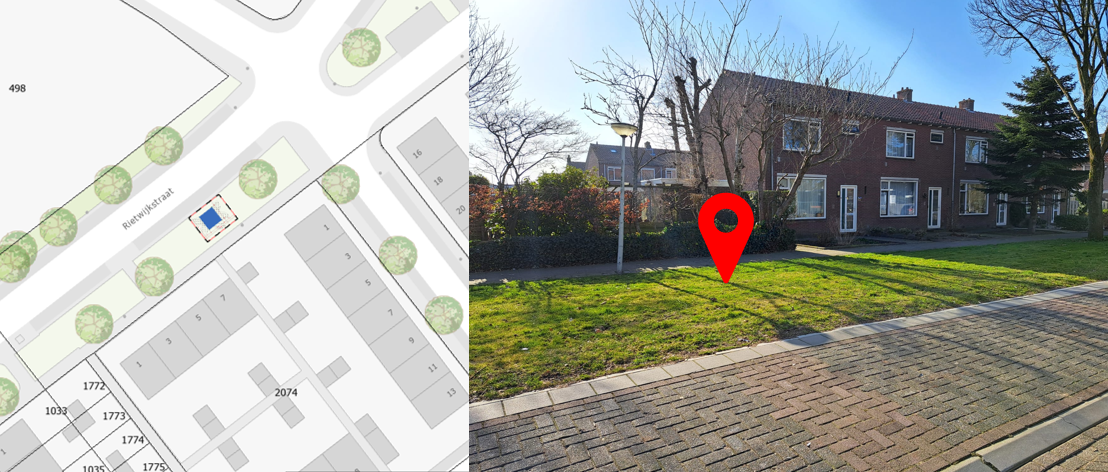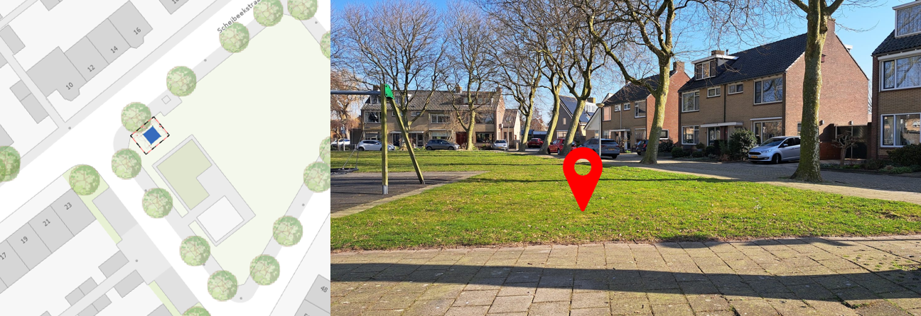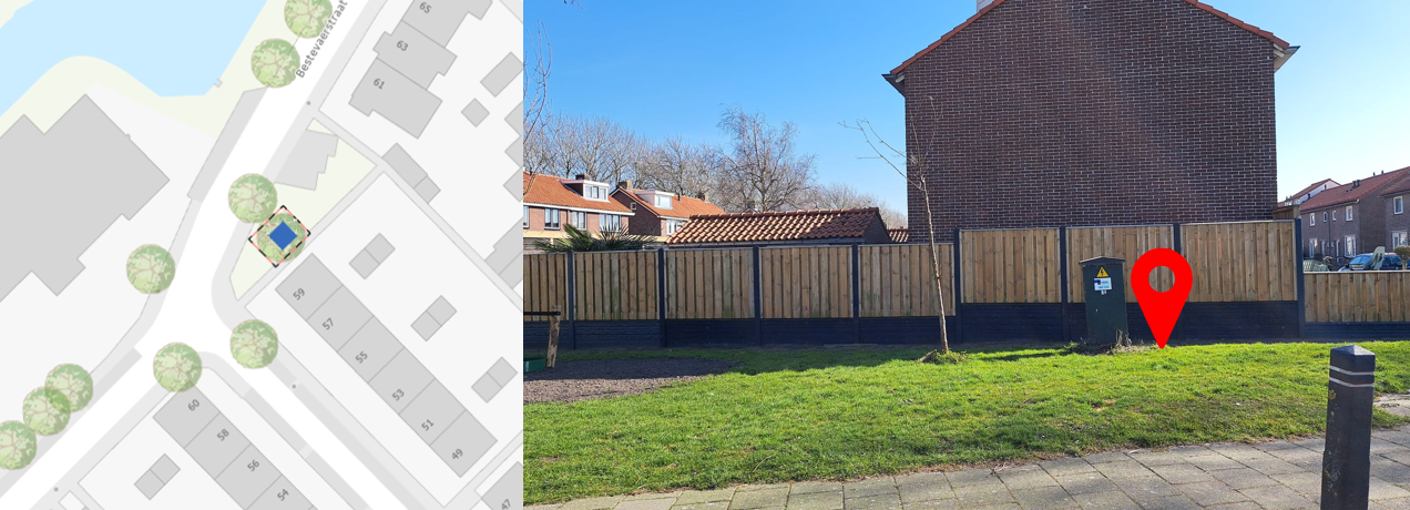 Tussen de twee jonge bomen in. Door het elektriciteitshuisje kan de laagspanningskast van Liander weg.