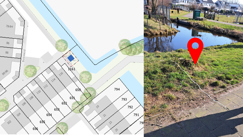 Op het grasveld. We plaatsen een hek aan de waterkant voor de veiligheid van de monteur.