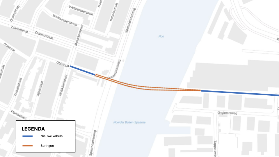 We starten met deelproject 1 in de omgeving van de Planentenlaan. Vanaf 12 januari 2026 voeren we in de eerste fase twee boringen onder het Spaarne uit om het elektriciteitsnet in Haarlem verder uit te breiden. Op het kaartje hieronder ziet u waar we aan het werk gaan.