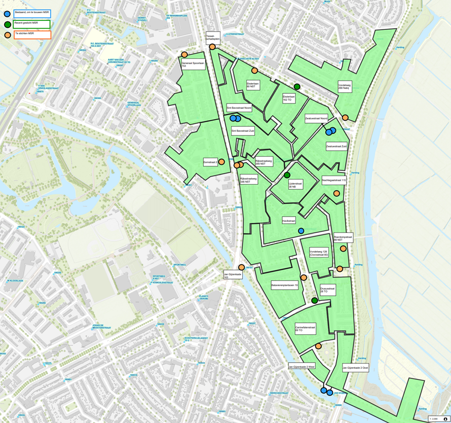 - In het blauw de bestaande huisjes die we vervangen. In het groen de huisjes die al zijn geplaatst.