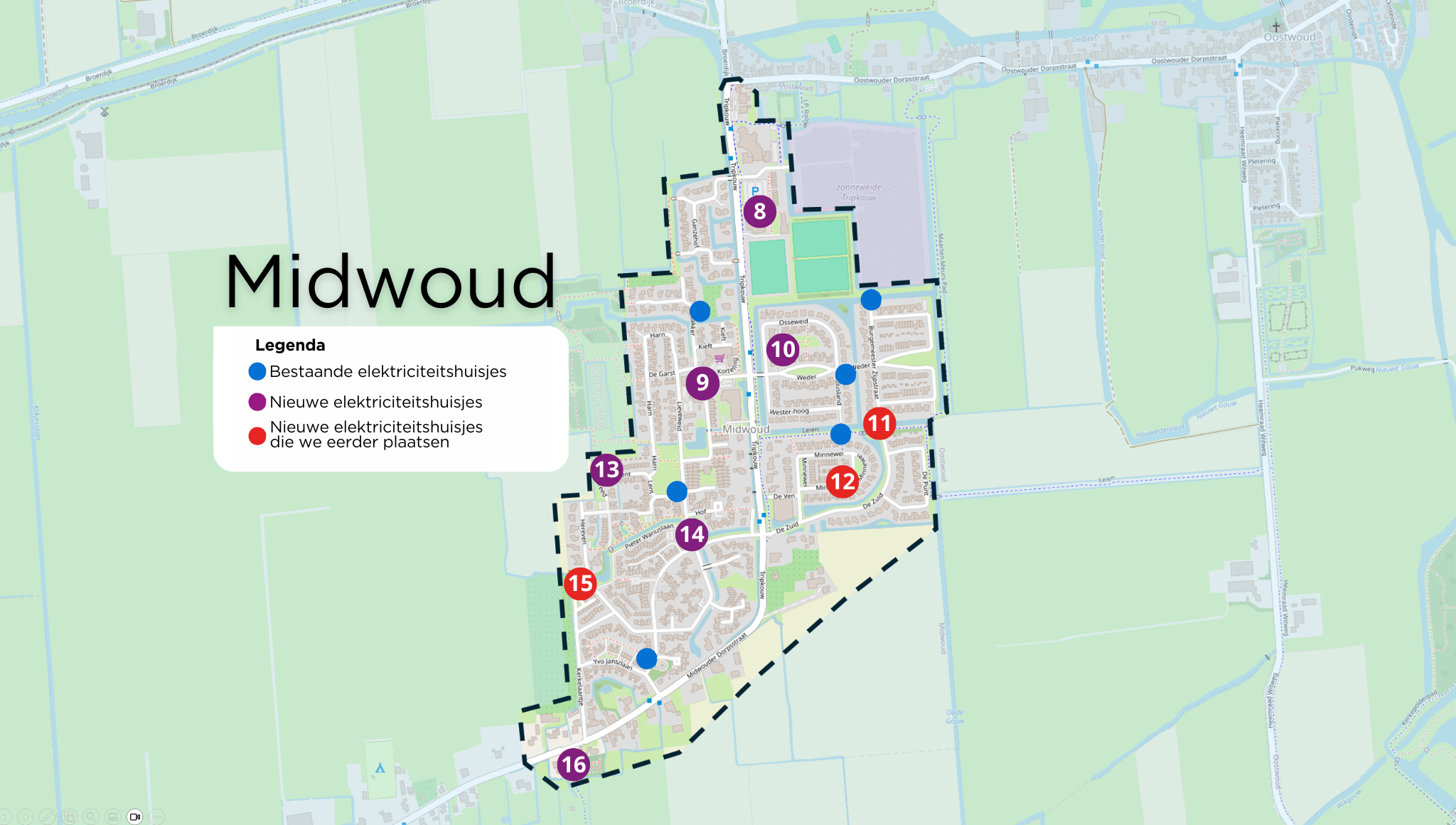 We breiden het stroomnet uit. Zodat dit kan werken zoals u van ons gewend bent. Er komen 9 elektriciteitshuisjes bij. Hierdoor worden de kabels korter en wordt het stroomnet krachtiger. Lees op deze pagina meer over de buurtaanpak in Midwoud Centrum.