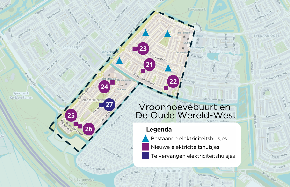 Er komen 6 nieuwe elektriciteitshuisjes voor de uitbreiding van het stroomnet. Ook vervangen we 1 huisje wat er al staat. Samen met de gemeente zoeken we zorgvuldig naar geschikte plekken. Als we het werk gaan uitvoeren leggen we ook meer kabels en vervangen we bestaande kabels.