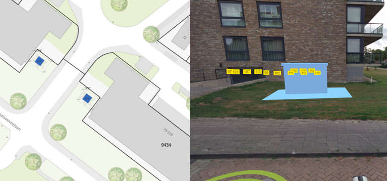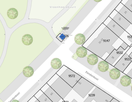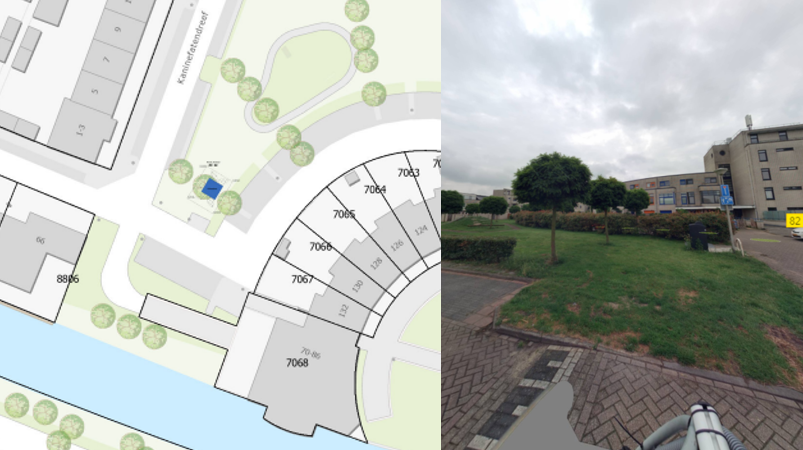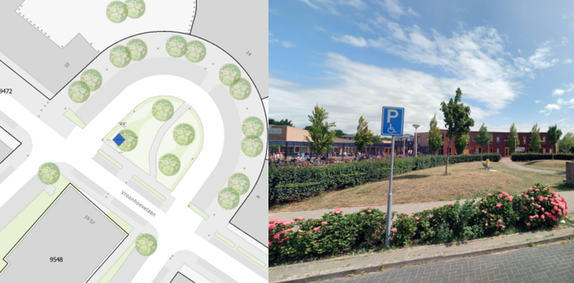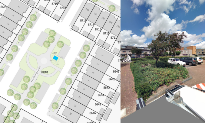 In het groen naast de parkeervakken. Het huisje krijgt een dennengroene kleur.