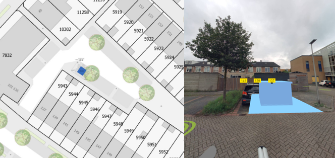 Op 2 parkeervakken en een deel van de stoep. Het huisje krijgt een dennengroene kleur.