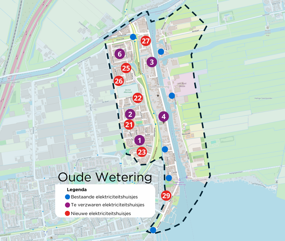 We plaatsen 7 nieuwe elektriciteitshuisjes en vervangen 5 bestaande huisjes. We verdelen het gebied in verschillende delen die we na elkaar aanpakken. Een onderaannemer voert de werkzaamheden uit. Op het moment dat de planning duidelijk is, ontvangt u een brief met meer informatie over werkzaamheden. Meer weten over de plekken? Zie de uitleg per plek onder de kaart.