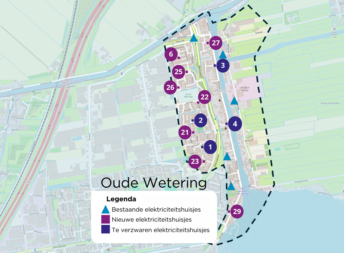 We plaatsen 8 nieuwe elektriciteitshuisjes en vervangen 4 bestaande huisjes. We verdelen het gebied in verschillende delen die we na elkaar aanpakken. Een onderaannemer voert de werkzaamheden uit. Op het moment dat de planning duidelijk is, ontvangt u een brief met meer informatie over werkzaamheden. Meer weten over de plekken? Zie de uitleg per plek onder de kaart.